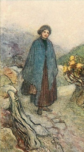 The speaker was an old woman in a blue hooded cloak and white cap, and was sitting on a bank of fox-gloves in a green dell of Wicklow. Beside her was the stick that had helped her out to enjoy the sweet after-coolness of the remnant of a day in July. Along the sky, behind, spread a lake of gold which the darkening oak-trees made a serrated shore; opposite to her the summer night was creeping leisurely up the dewy shamrock pastures.